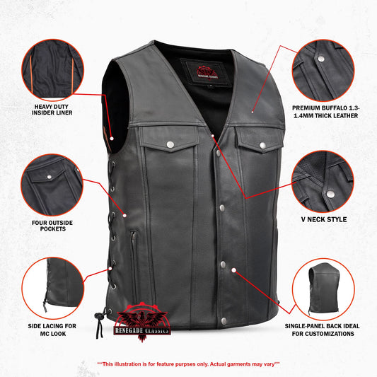 Men's Black Leather Vest with Side Laces and Smart Access Pockets