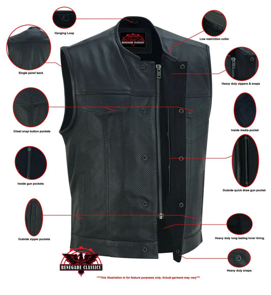Men's Collarless Perforated Leather Vest - Black