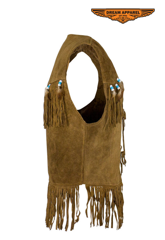 Women Brown Western Style Vest with Fringes and Beads Genuine Leather