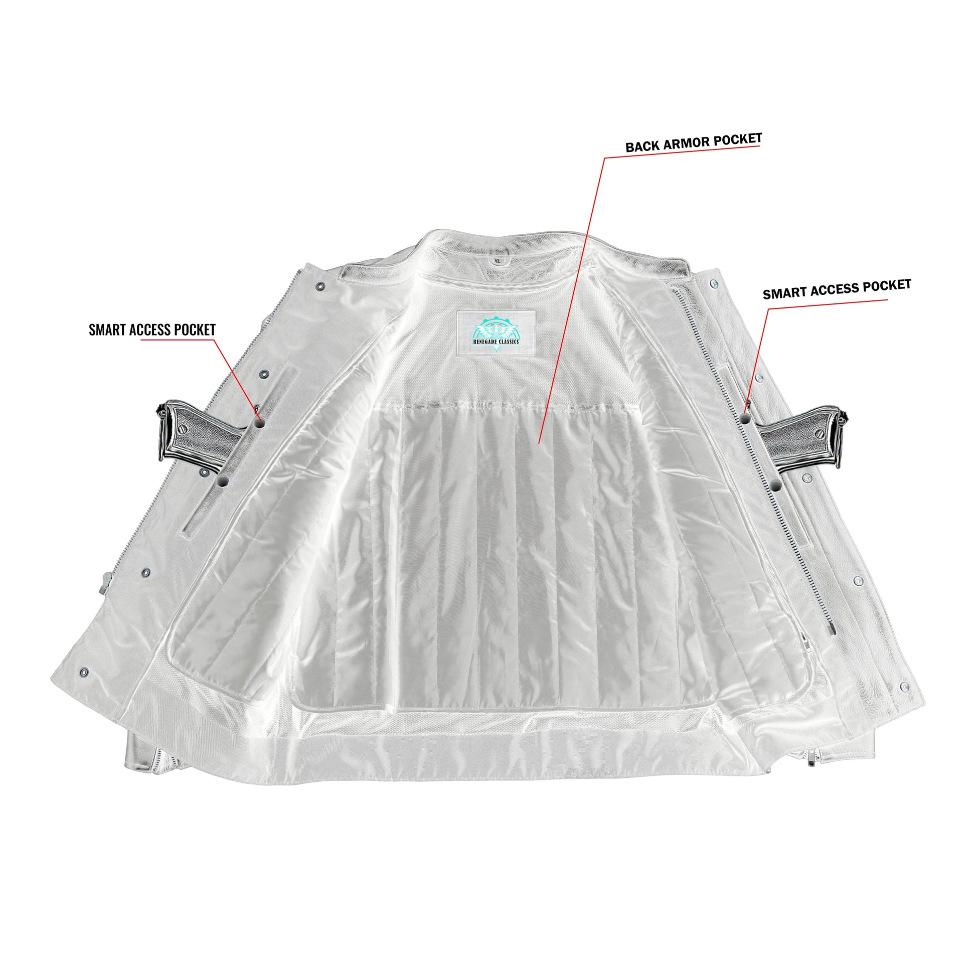 2 upgraded style concealed gun pockets between the snap and the zipper made of special heavy-duty textile with built-in holsters and snap closure.