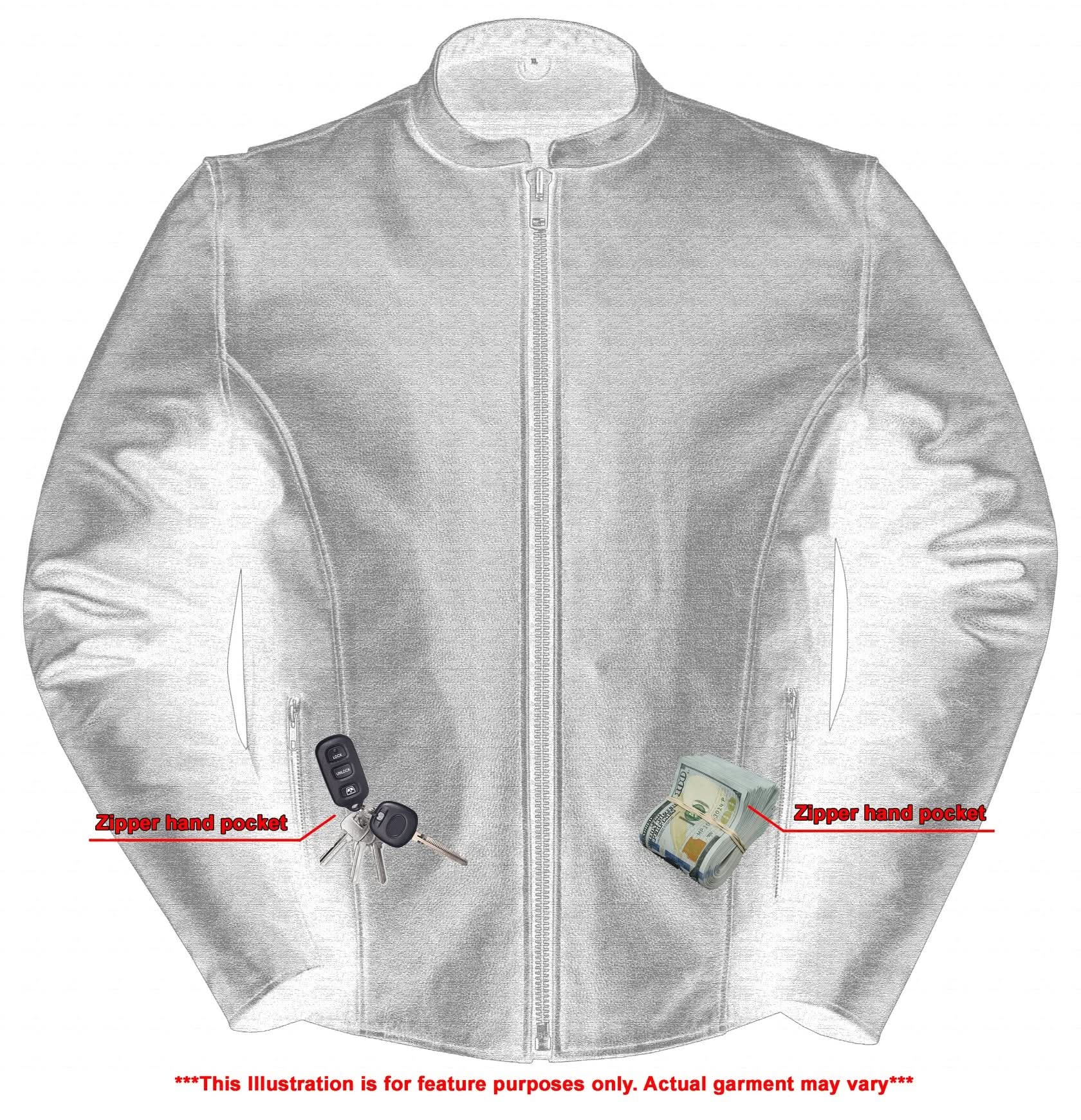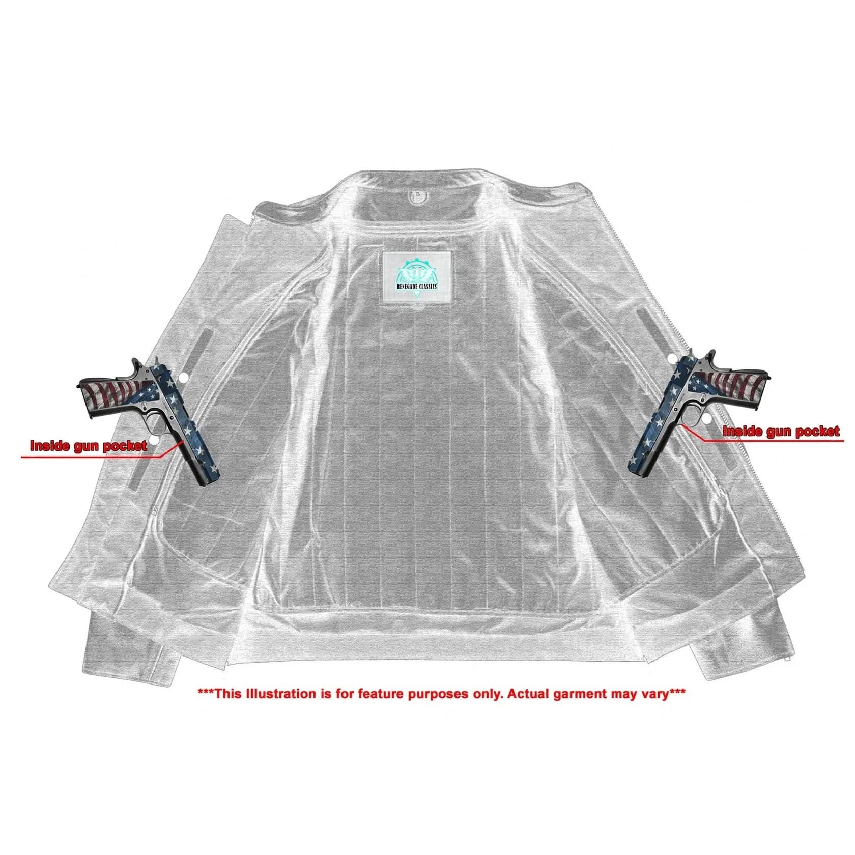 2 inside concealed gun pockets made of special heavy duty textile with built-in holsters and snap closure.