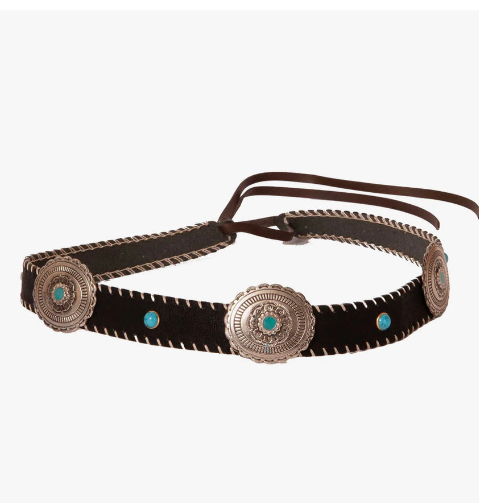 As the misty night air envelopes you the moonlight glistens off of your American Hat Makers Twilight hat band's conchos. Make any hat the in-between of day and night. With the balance of an acrobat the Twilight combines the smooth dexterity of leather with the glistening beauty of three massive shiny Conchos. Completed with turquoise embellishments this hat band will instantly upgrade your style possibilities. Upgrade, update, and renovate with American Hat Makers finest... The Twilight.